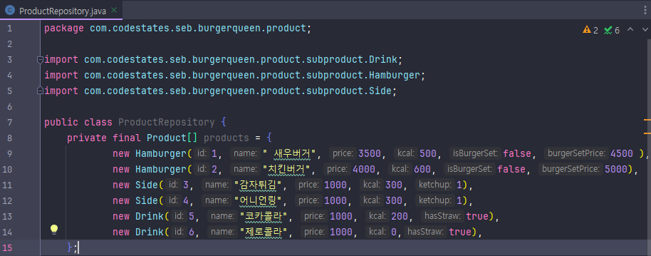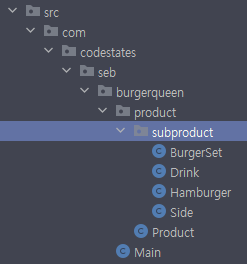 ★햄버거 세트는 햄버거+사이드+음료로 구성 세트 객체를 만들어서 속성으로 나누기